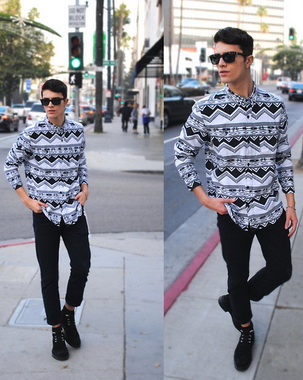 小花纹的藏蓝色衬衣,袖口的翻遍设计,搭配简约的深色牛仔裤,以复古的宽边皮带作为分隔,领口的棕色领结是整套搭配的亮点,在穿着衬衣的时候搭配领结,能够打破衬衣穿着带来的固有沉闷感。