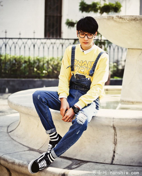 暖男风格的搭配在于能够给人带来一种平易近人的感觉,在衣着的选择上也同样是很有讲究的,内搭选择的是卡通风格的卫衣,搭配破洞风格的牛仔背带裤,非常阳光,搭配黑色的帆布鞋,一套经典的暖男装扮。