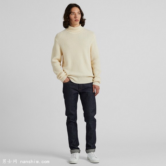 上半身米白色翻领长袖针织衫,休闲、文艺又高冷,禁欲系气息满满!下身搭配牛仔长裤(挽起裤脚),整个人看上去时尚又潮流!