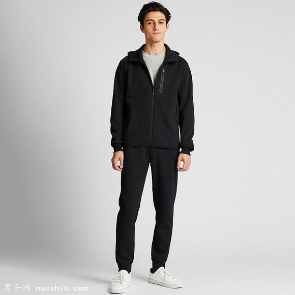 下半身黑色运动长裤,休闲又充满活力!上半身搭配黑色拉链开衫连帽外套,黑色一体,保暖的同时更显神秘气质。