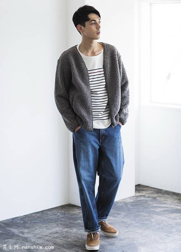 下身长款牛仔裤,搭配条纹T恤,外配一件仿羊羔绒开衫外套(内搭外穿两相宜,考究的V领款型,适合与多款单品搭配穿着),保暖的同时又不落俗套,引领时代潮流,酷气十足。(图来源于:优衣库官方旗舰店)