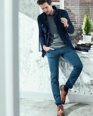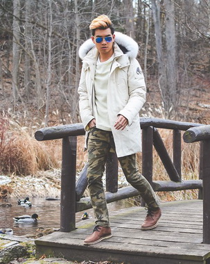这位小哥哥上半身内穿深绿色圆领针织衫,外披黑色连帽夹克外套;下半身搭配深灰色长绒运动裤。这身打扮即保暖同时不落俗套,非常时尚。