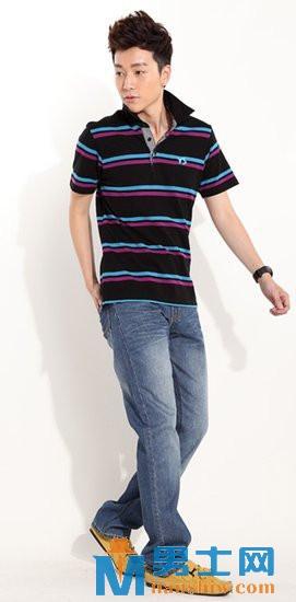 今夏最潮牛仔穿搭法,时尚韩版直筒牛仔裤加上修身又不紧促的时尚撞色条纹POLO衫,稳重又青春活力,牛仔裤上的猫须水洗磨白效果,更是给整体添加了不了时尚活力的元素,大秀成熟男人的硬朗气质。