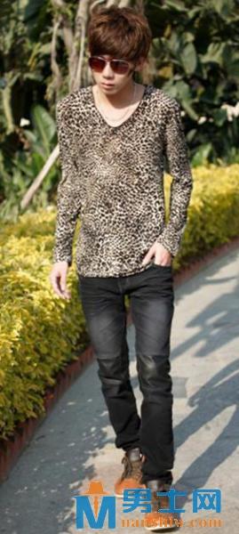 豹纹一直流行款,穿豹纹带着一种不羁,是野性味道的成熟,外表稳重沉实,实质对个性有着一种解放的渴望,男士穿豹纹显得非常前卫,豹纹装符合90后的思想性格穿着特点。