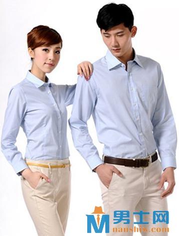 同样是蓝色款的情侣衬衫,这一款就来得稍微正式一点了,淡蓝色之上点缀以细小的条纹,凸显出了职场人对细节和品质的重视程度,干练、知性、果断。