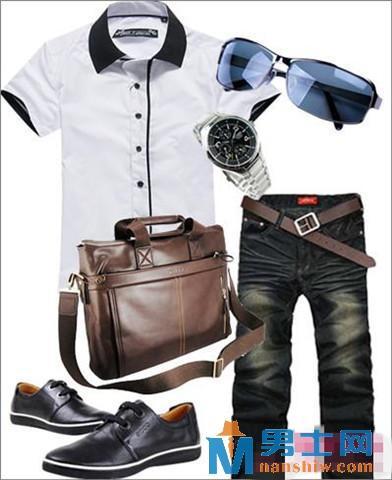 黑色镶边的白色短袖衬衫,避免了纯白的单调,是韩版风格,搭配牛仔长裤,配个商务包包,此款搭配适合刚毕业不久的职场男生,既休闲但在职场上又显干净利落。