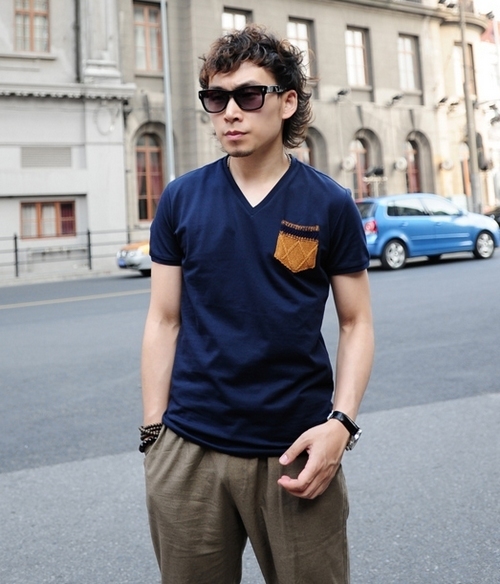 胸前针织口袋鸡心领设计高棉短袖T恤,今年的大热款式!