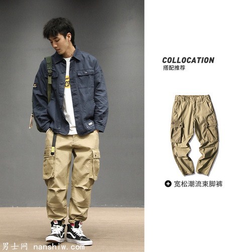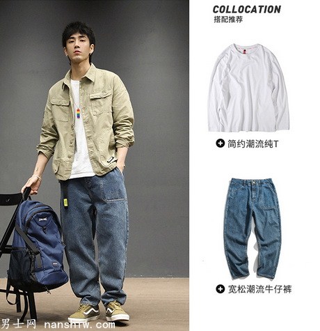 卡其色工装夹克+纯白色T恤+蓝色宽松牛仔裤+卡其色帆布鞋