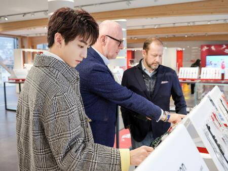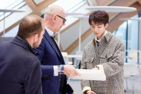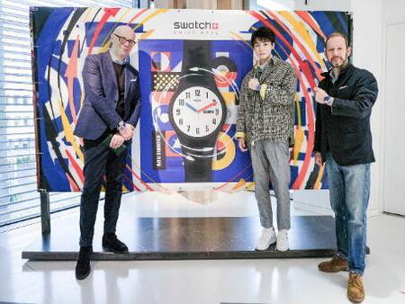 王俊凯与Swatch全球创意总监Carlo先生、Swatch全球首席运营官Gonzalo先生合影留念